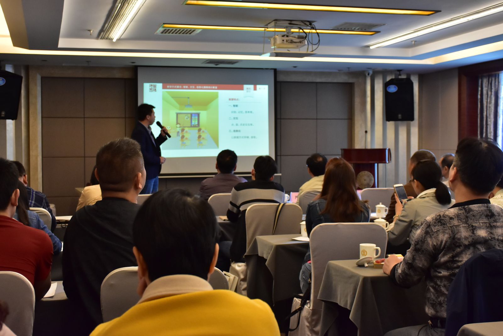 湖南隐智科技有限公司销售部负责人丁一舟,正在进行“电子棋盘以及隐智少儿平台营销模式”讲解。